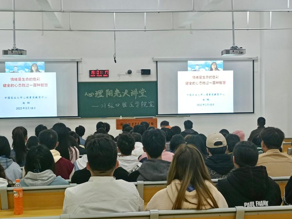 口腔医学院为了提升学生的心理素质,帮助学生从容应对学习生活中的挫折与挑战,形成稳健的心理和人格,拥有良好的心态和情绪,积极响应学校号召,于3月18日晚19:00在新桥校区教106,组织2021级学生收看了《情绪是生命的色彩——好心态胜过一百种智慧》的心理健康线上讲座。