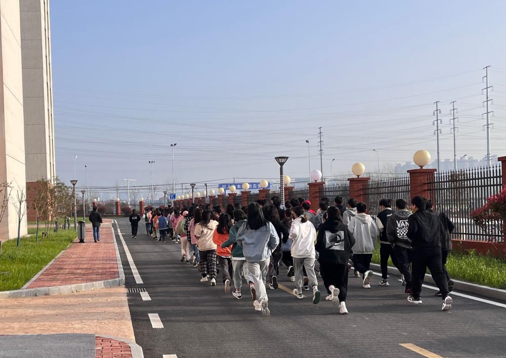 清晨的校园一派宁静,同学们洗漱完毕,整理好寝室内务,定时定点在3号楼前集合,以班级为单位排列好队伍整装待发,进行跑操活动,同学们活跃的身姿与唯美的校园景色交融在一起,热情洋溢,朝气蓬勃。跑操完毕,大家的困意已经褪去,精神饱满地全身心投入到一天的学习当中去,青春洋溢的精神风貌得到完美诠释。