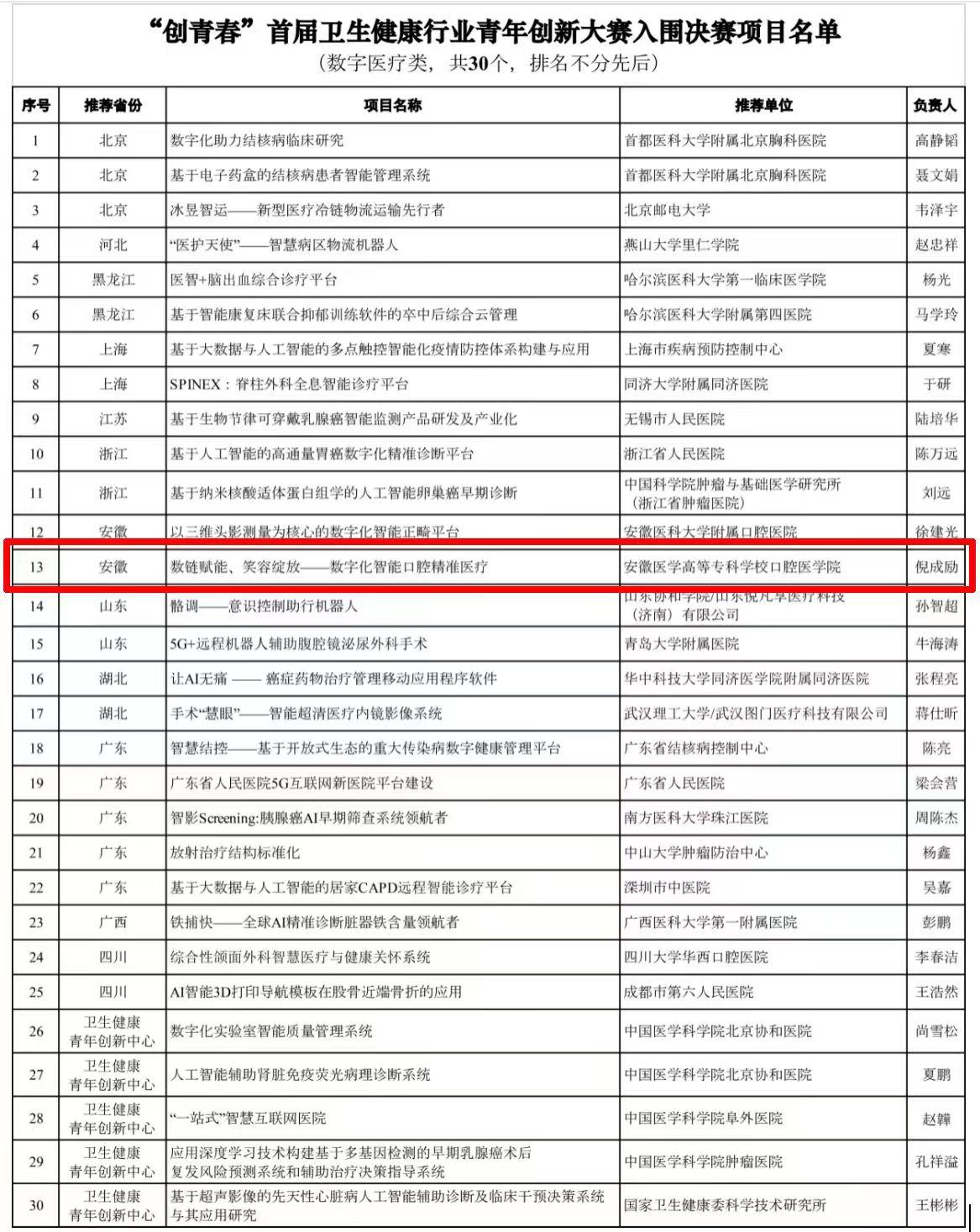近日,由共青团中央青年发展部、国家卫生健康委文明办、中国青年创业就业基金会主办,国家卫生健康委直属机关团委、卫生健康青年创新中心承办的第八届“创青春”中国青年创新创业比赛卫生健康行业专项赛暨首届全国卫生健康行业青年创新大赛公布入围决赛名单。我校口腔医学院倪成励团队“数链赋能、笑容绽放——数字化智能口腔精准医疗”项目成功入围“创青春”首届全国卫生健康行业青年创新大赛(数字医疗类)决赛。