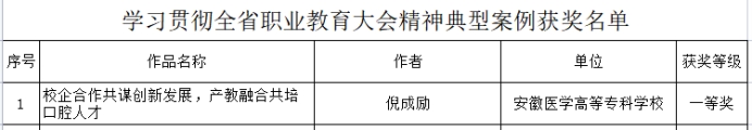 近日,安徽省教育厅公布了“学习贯彻全省职业教育大会精神主题征文、典型案例、先进人物事迹征集活动”获奖结果,口腔医学院副院长倪成励报送典型案例“校企合作共谋创新发展,产教融合共培口腔人才”1件,荣获一等奖。