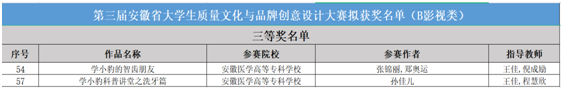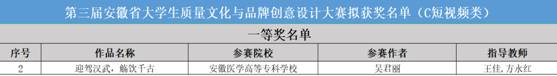 近日,由安徽省市场监督管理局、安徽省教育厅、安徽省文化和旅游厅、中国共产主义青年团安徽省委员会、安徽省科协技术协会共同主办的第三届安徽省大学生质量文化与品牌创意设计大赛评选结果揭晓,我院学子作品从数万件参赛作品中脱颖而出,荣获一等奖1项,三等奖2项。